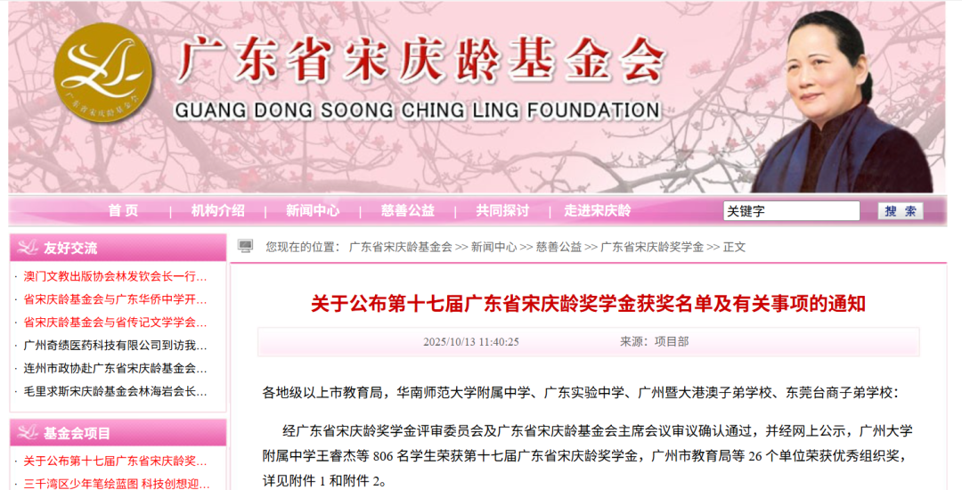 据悉,本届广东省宋庆龄奖学金将为每名获奖学生提供2000元奖金,以资鼓励。